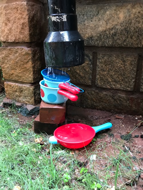She splashed in the muddy puddles and danced around in the rain happily. I asked her to wear a shower cap coz it had become pretty cold and I din’t want her to catch it. She happily agreed coz at least she was getting to wet herself. After some splashing and dancing she went in to change. But it wasn’t over there. She wanted more! So her cousin and she got pots and pans from their pretend play and placed it in the rain to make a fountain! (In the pic) They even placed a small sieve on top saying the water will get filtered. They created a simple fountain with cascading water and a filteration system π. And they were so happy with it.
