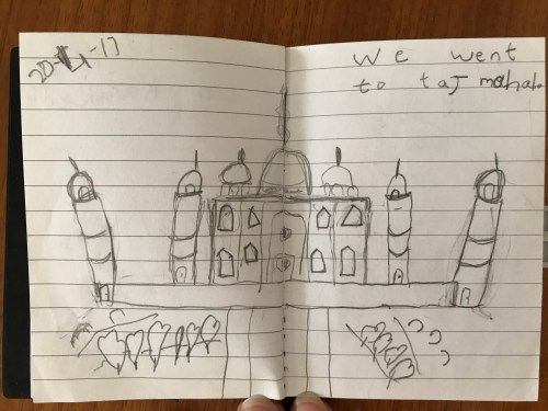 P, A and me had a small holiday on our own last April. We went to Gurgaon to their Bua’s and then Agra to another Bua’s. Yeah i know…. it’s not the best season to travel north. But we had holidays at that time and it was just like ….. let’s just go or it’s never happening. While on the trip I encouraged P to maintain a travel diary. I actually wanted her to write what she is doing everyday. Just a small account of it in her own words. But instead she came up with the fabulous idea of sketching! So everyday she drew one highlight of the day in her own little notebook. I must say I was impressed by what she had come up with. Initially she kept saying tell me what to do but I kept telling her just think. I questioned her…. what did we do today? What was the best thing you liked about today? And she got the hang of it in a couple of days. I came across the book today and while I went through it, I was like wow! This is so amazing. I can encourage her to do this every trip we go and she will be collecting some lovely memories through her drawings…..AND she will pick up the habit of expressing her thoughts in her drawings.