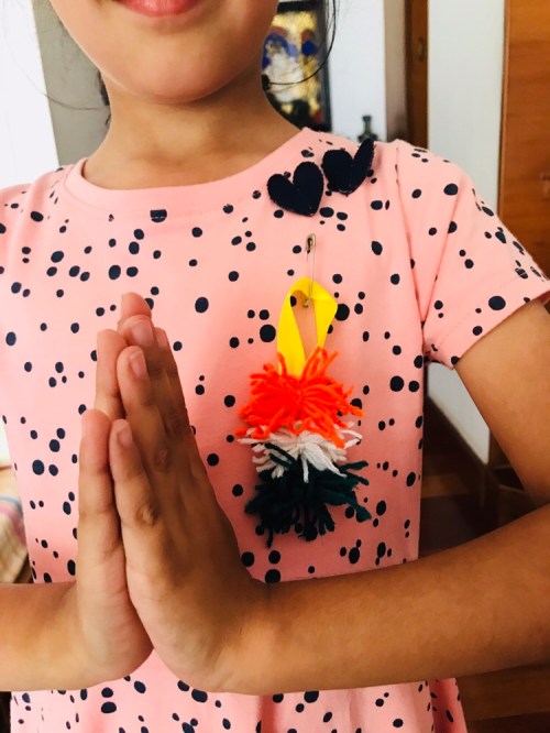 She also made a small badge of Pom poms which she started in school. She had made the Pom poms in school and assembled them at home. Proudly wore it around all day.