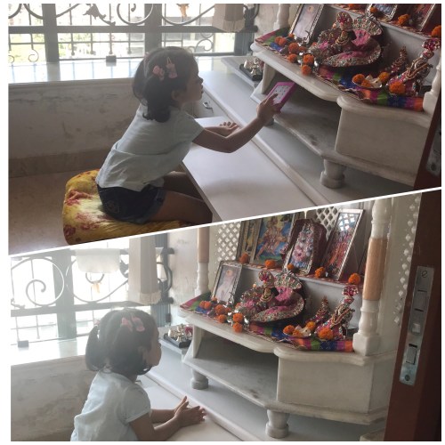 Another of her favourite activities was bathing the idols. My mum has the idol of Little baby Krishna (we call him Laddoo Gopal) and it is said that if you keep that idol at home you have to treat Him like a baby. Bathe Him, dress Him, feed Him. Even change His clothes at night and make Him sleep on His bed, blanket and all. So everyday the girls would rush to bathe the little baby Krishna. They loved every part of the process. Bathing Him and making the sandalwood paste to adorn His forehead. Dressing Him up and making Him wear all the jewels and the crown. Then placing the flowers at His feet and finally the Aarti.