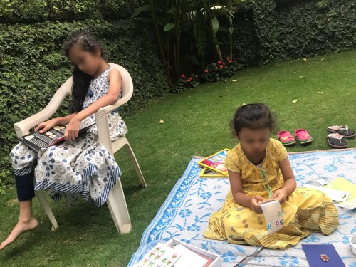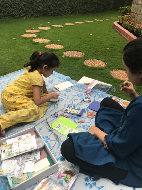After a long time we had a relaxed Sunday evening. With nothing to do we lazed around in the garden on a chatai (Mat). A had been after me since morning that she wanted to do some craft. So she brought her little box of craft stuff ( we bought a craft kit from Itsy Bisty recently which has a lot of cool stuff for crafting) and sat down to create. She wanted to first make a card for me and Papa. Slowly it changed from papa to Amma because papa already has too many cards (made by her). Ultimately it changed from Amma to Baba and finally she wanted to make one for me and one for decoration purpose only. On daughters day my daughter gave me card π