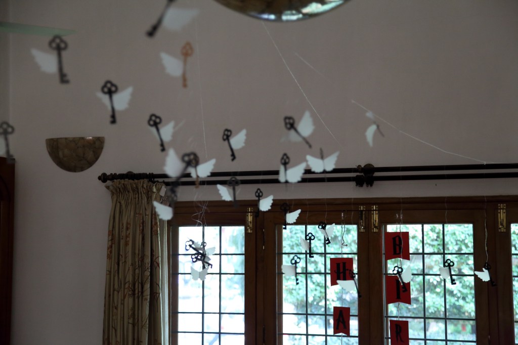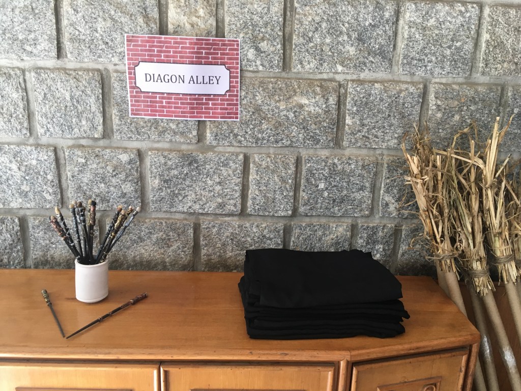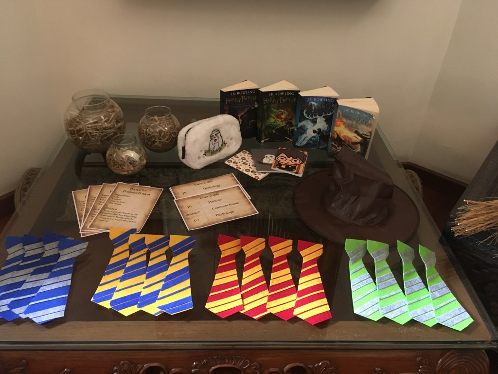 I had made a sorting hat and house ties for the sorting. We had a Diagon alley at the entrance where the kids could pick their robes (as a last minute addition I had to get these made in 2 days) and wands (we made those too). Then platform 9 3/4 at the door. They enter Hogwarts and we had some flying keys decor and hanging candles. The whole thing was super super fun. And even though we were behind schedule, we managed to get through both periods but had to let go of the bonus games coz it was getting late.