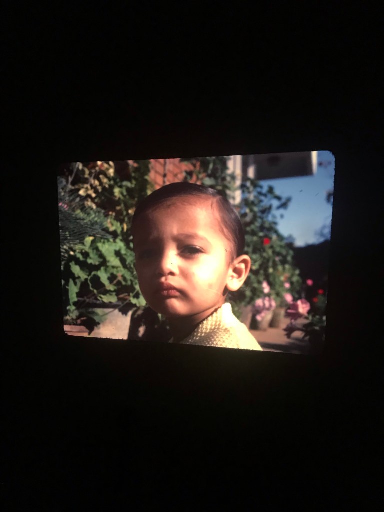 An indoor tent A tiny tea partyP made an Independence Day quiz for all family members. She researched some monuments and facts about indian cuisines and info on states and made a super fun and informative quiz for usWe removed a 40 year old projector which projects slides. Their grandfather has a ton of old slides with pictures from way back in the 1980’s. The kids love watching them. This is one such image of their dad projected on the wall.