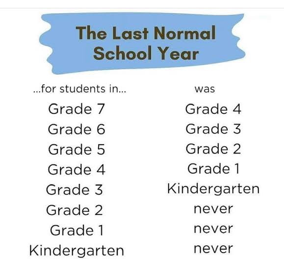 I found this image on the internet and when the facts were in front of me it kinda came as a a shock. Well.. for India it might not hold completely true. P is in grade 6 and for her the last normal (almost) year was grade 4. They only lost the last 20 days of school for grade 4. But yes it was an abnormal ending for a school year.